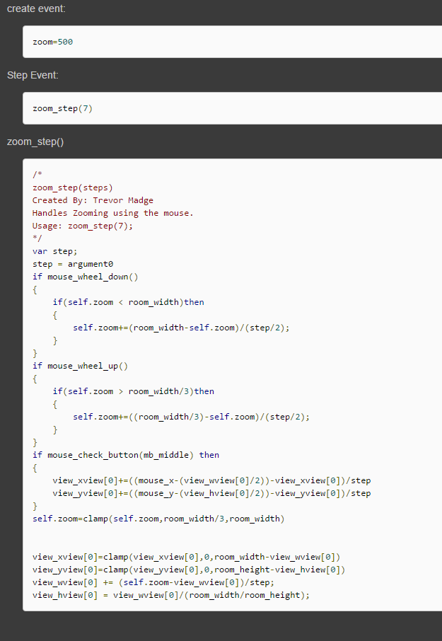 Today I began to create zooming in and zooming out in our game. I'm trying to use the scroll wheel for it because it seems easier to use. It seems that most of the code used for zooming is used with plus or minus. I'm going to have to find what the mouse wheel is in game maker. I did find some code to use for zooming but while messing around with it. It didn't really work maybe because the values might not be right for the screen size. Our screen size is 700 by 1600 so I messed around with the values. With the code it starts out with a zoom factor and that isn't and established code in game maker so that might be the problem. I will continue to work on this for the next day try to fix this but i might have to look up some other code for it.